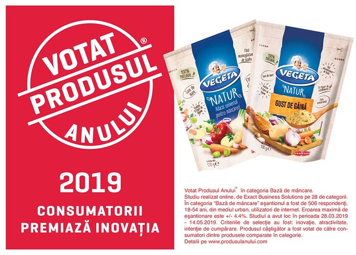 Bucuresti, 16 Mai 2019. In cadrul celei de-a 10a editii a Galei “Votat Produsul Anului® – Consumatorii premiaza inovatia”, gama Vegeta NATUR a fost desemnata castigatoare in categoria Baze pentru mancare.